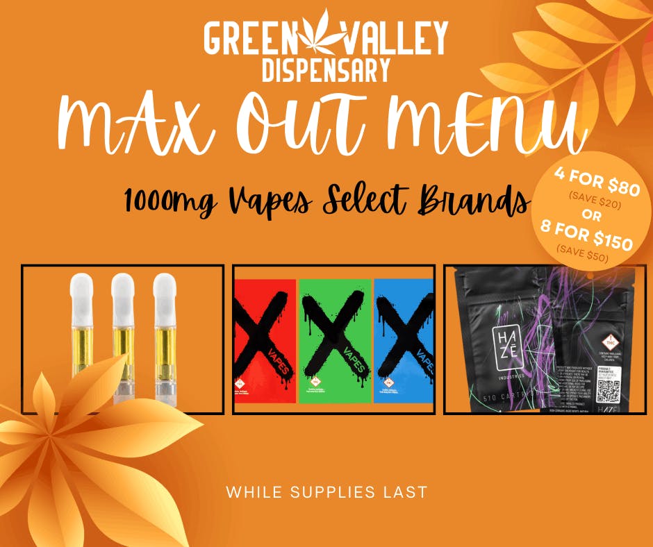 1000mg Disposable Vapes – Powerful & Convenient! Enjoy smooth, long-lasting vapor with select brands like Xvapes, Haze, and more. Perfect for on-the-go use, these disposables deliver potency and flavor in every puff. Special deals: 4 for $80 (save $20) or 8 for $150 (save $50). While supplies last. No stacking discounts.